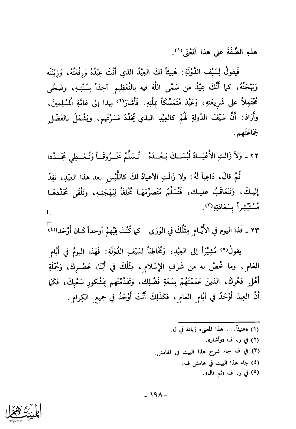فيقول لسيف الدولة: هنيئاً لك العيد الذي أنت عيده ورفعته، وزينته وبهجته، كما أنك عيد من سمى الله فيه بالتعظيم آخذا بسنته، وضحى محتملاً على شريعته، وعيد متمسكاً بملته. فأشار بهذا إلى عامة المسلمين، وأراد: أن سيف الدولة لهم كالعيد الذي يجدد مسرتهم، ويشمل بالفضل جماعتهم.