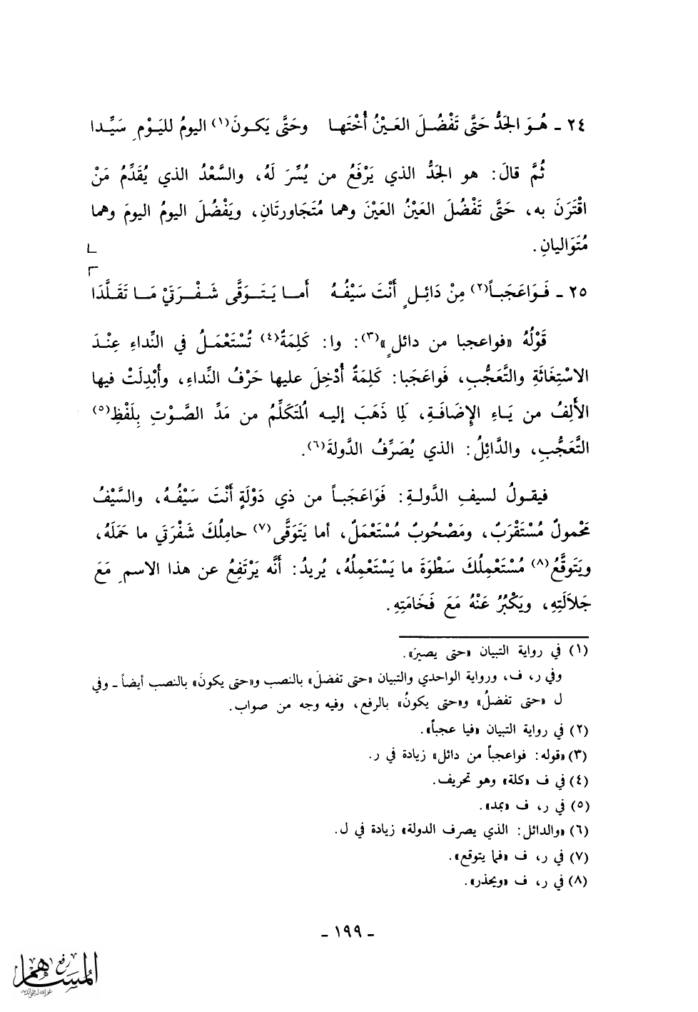 فيقول لسيف الدولة: فواعجباً من ذي دولة أنت سيفه، والسيف محمول مستقرب، ومصحوب مستعمل، أما يتوقى حاملك شفرتي ما حمله، ويتوقع مستعملك سطوة ما يستعمله، يريد: أنه يرتفع عن هذا الاسم مع جلالته، ويكبر عنه مع فخامته.