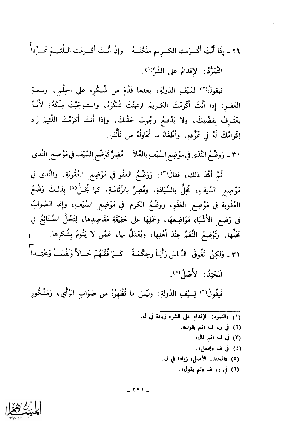 ثم أكد ذلك، فقال: ووضع العفو في موضع العقوبة، والندى في موضع السيف، مخل بالسيادة، ومضر بالرئاسة؛ كما يخل بذلك وضع العقوبة في موضع العفو، ووضع الكرم في موضع السيف، وإنما الصواب في وضع الأشياء مواضعها، وحملها على حقيقة مقاصدها، لتحل الصنائع في محلها، وتوضع النعم عند أهلها، ويعدل بها، عمن لا يقوم بشكرها.