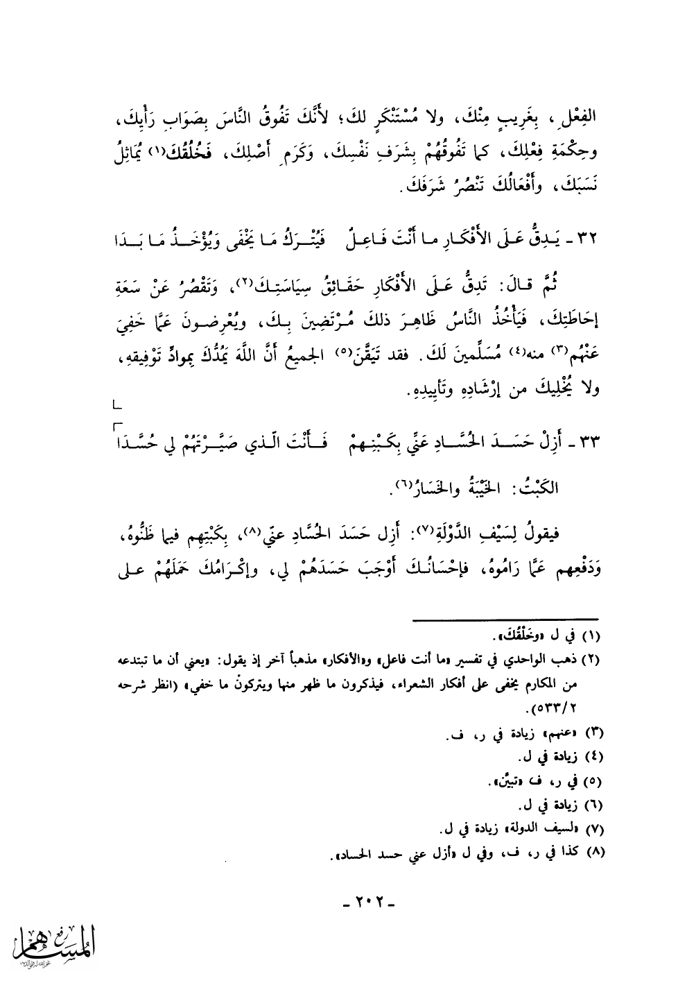 ثم قال: تدق على الأفكار حقائق سياستك، وتقصر عن سعة إحاطتك، فيأخذ الناس ظاهر ذلك مرتضين بك، ويعرضون عما خفي عنهم منه مسلمين لك. فقد تيقن الجميع أن الله يمدك بمواد توفيقه، ولا يخليك من إرشاده وتأييده.