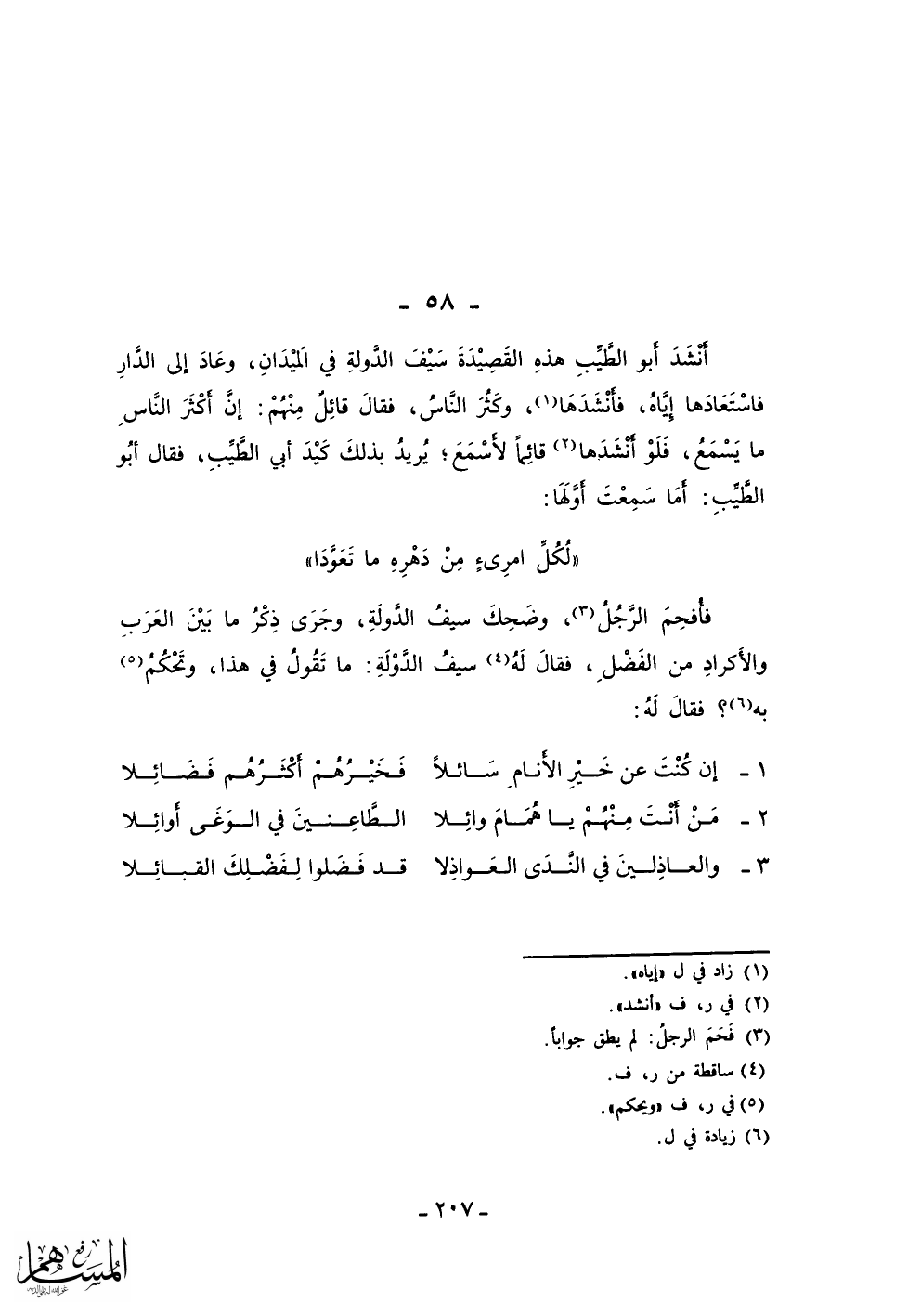 فأفحم الرجل ن وضحك سيف الدولة، وجرى ذكر ما بين العرب والأكراد من الفضل، فقال له سيف الدولة: ما تقول في هذا، وتحكم به؟ فقال له: