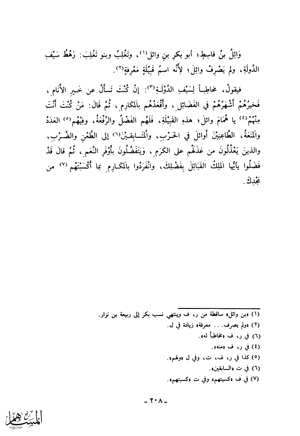 وائل بن قاسط؛ أبو بكر بن وائل، وتغلب وبنو تغلب: رهط سيف الدولة، ولم يصرف وائل؛ لأنه اسم قبيلة معرفة.