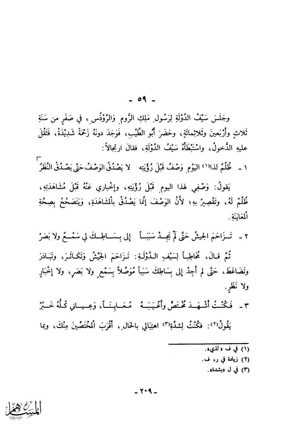 ثم قال، مخاطباً لسيف الدولة: تزاحم الجيش وتكاثر، وتبادر وتضاغط، حتى لم أجد إلى بساطك سبباً موصلاً بسمع ولا بصر، ولا إخبار ولا نظر.