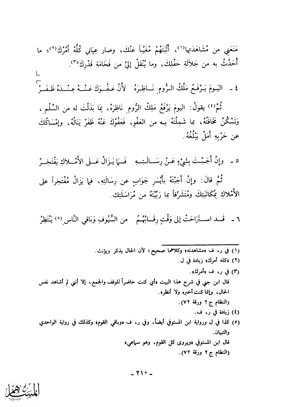 ثم يقول: اليوم يرفع ملك الروم ناظره، بما بذلت له من السلم، وتسكن مخافته، بما شملته به من العفو، فعفوك عنه ظفر يناله، وإمساكك عن حربه أمل يبلغه.