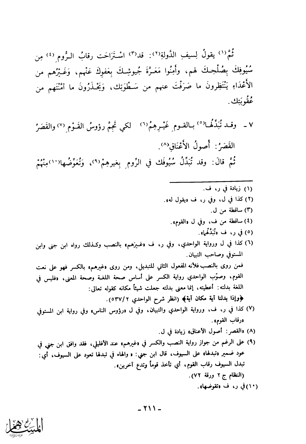 ثم قال: وقد تبدل سيوفك في الروم بغيرهم، وتعوضها منهم