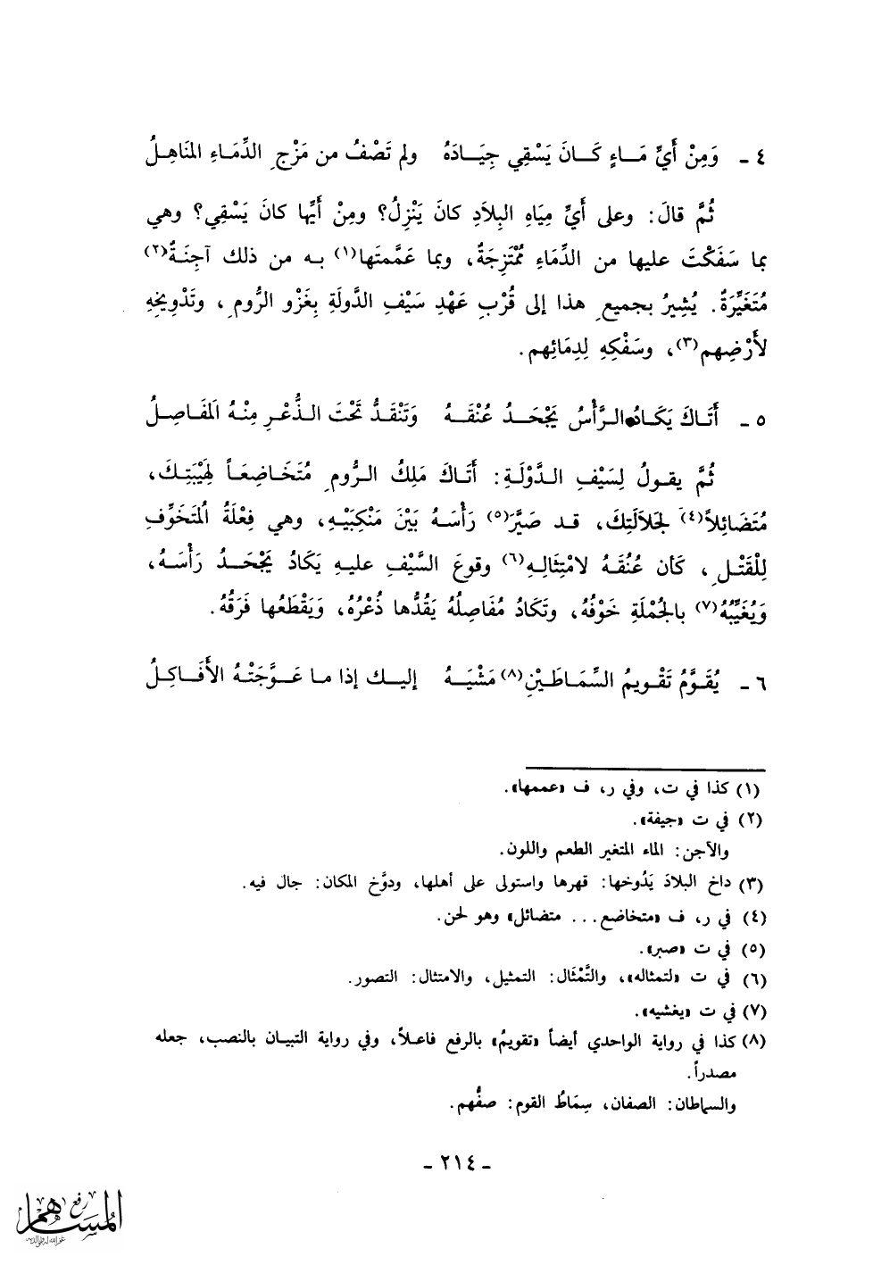 ثم قال: وعلى أي مياه البلاد كان ينزل؟ ومن أيها كان يسقي؟ وهي بما سفكت عليها من الدماء ممتزجة، وبما عممتها به من ذلك آجنة متغيرة. يشير بجميع هذا إلى قرب عهد سيف الدولة بغزو الروم، وتدويخه لأرضهم، وسفكه لدمائهم.