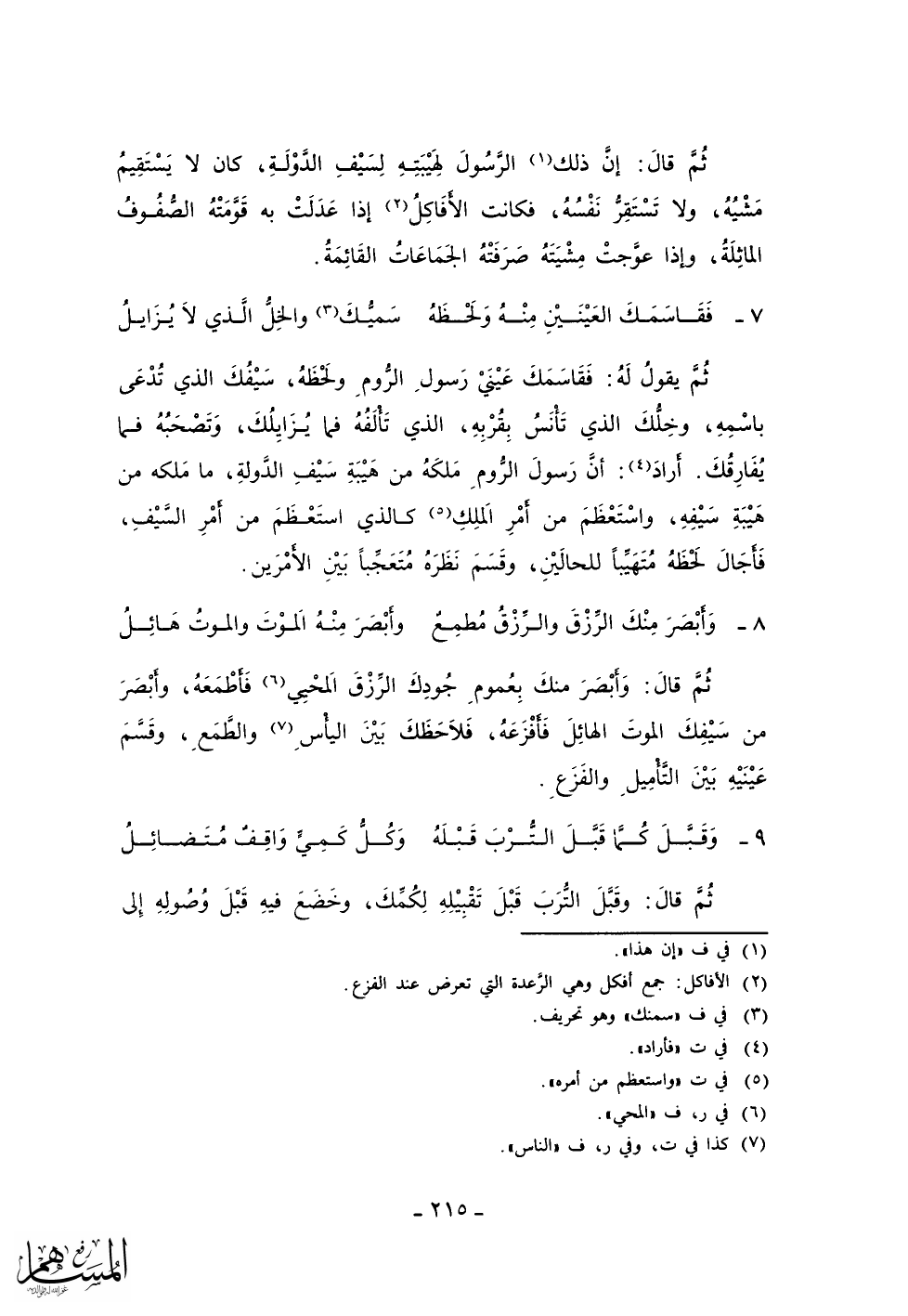 ثم يقول له: فقاسمك عيني رسول الروم ولحظه، سيفك الذي تدعى باسمه، وخلك الذي تأنس بقربه، الذي تأنس بقربه، الذي تألفه فما يزايلك، وتصحبه فما يفارقك. أراد: أن رسول الروم ملكه من هيبة سيف الدولة، ما ملكه من هيبة سيفه، واستعظم من أمر الملك كالذي استعظم من أمر السيف، فأجال لحظه متهيباً للحالين، وقسم نظره متعجباً بين الأمرين.