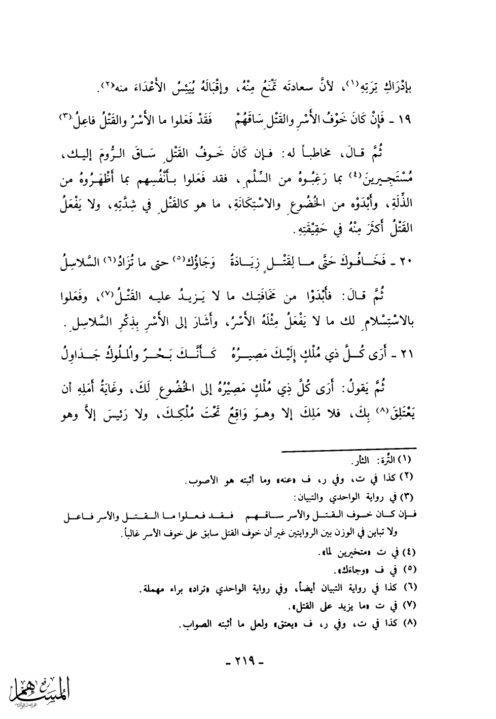 ثم قال، مخاطباً له: فإن كان خوف القتل ساق الروم إليك، مستجيرين بما رغبوه من السلم، فقد فعلوا بأنفسهم بما أظهروه من الذلة، وأبدوه من الخضوع والاستكانة، ما هو كالقتل في شدته، ولا يفعل القتل أكثر منه في حقيقته.