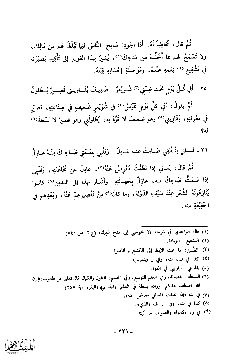 ثم قال: مخاطباً له: إذا الجود! سامح الناس فيما تبذل لهم من مالك، ولا تسمح لهم بما أخلده من مدحك، يشير بهذا القول إلى تأكيد بصيرته في تشفيع نعمه عنده، ومواصلة إحسانه قبله.