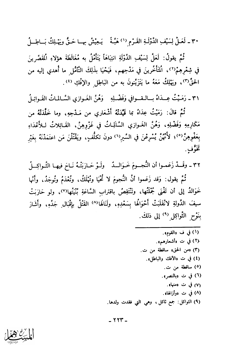 ثم يقول: وقد زعموا أن النجوم لا تحيا وتهلك، وتعدم وتوجد، وأنها خوالد إلى أن تفنى جملتها، وتنتقص باقتراب الساعة بنيتها، ولو حاربت سيف الدولة لانقلبت أحوالها بسعده، ولنالها القتل بإقبال جده، وأشار بنوح الثواكل إلى ذلك.