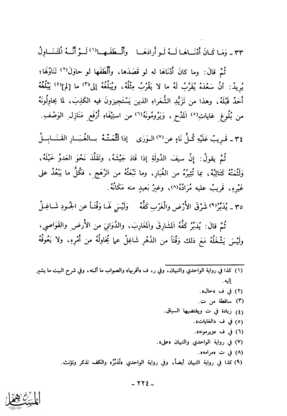 ثم قال: وما كان أدناها له لو قصدها، وألطفها لو حاول تناولها، يريد: أن سعده يقرب له ما لا يقرب مثله، ويبلغه إلى ما (لم) يبلغه أحد قبله، وهذا من تزيد الشعراء الذين يستجيزون فيه الكذب، لما يحاولونه من بلوغ غايات المدح،