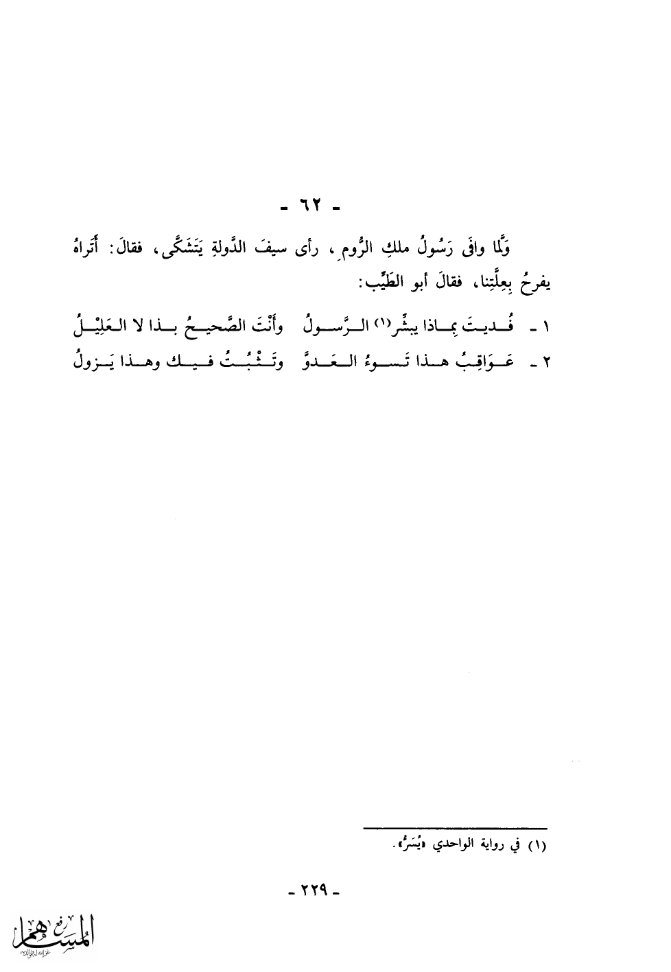 ولما وافى رسول ملك الروم، رأى سيف الدولة يتشكى، فقال: أتراه يفرح بعلتنا، فقال أبو الطيب: