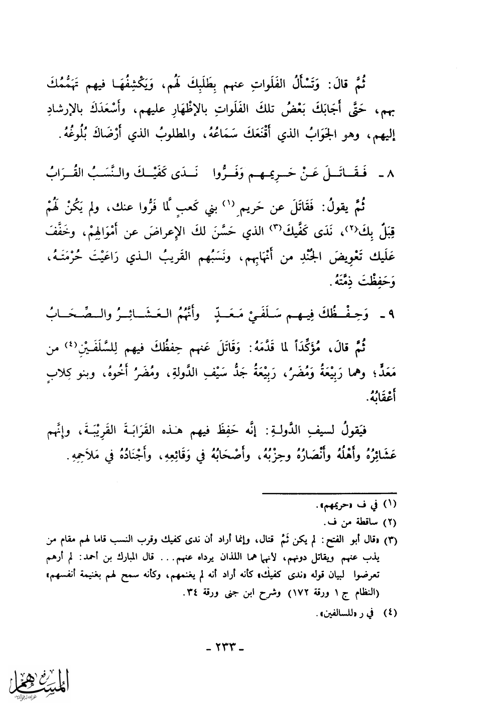 ثم قال، مؤكداً لما قدمه: وقاتل عنهم حفظك فيهم للسلفين من معد؛ وهما ربيعة ومضر، ربيعة جد سيف الدولة، ومضر أخوه، وبنو كلاب أعقابه.