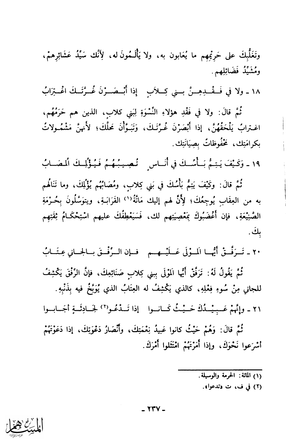 ثم يقول له: ترفق أيها المولى ببني كلاب صنائعك، فإن الرفق يكشف للجاني من سوء فعله، كالذي يكشف له العتاب الذي يربخ فيه بذنبه.