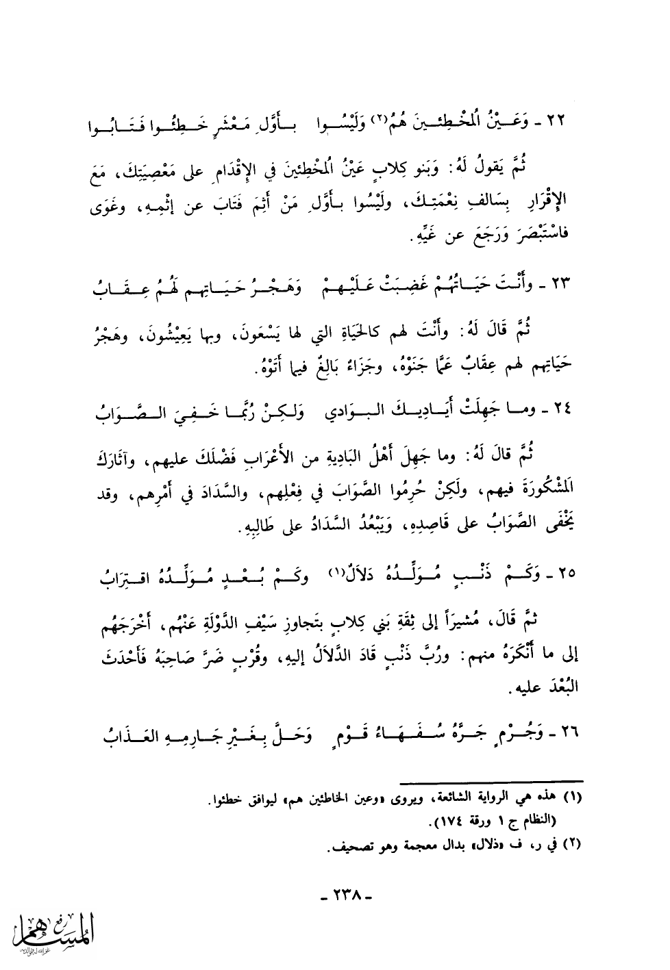 ثم يقول له: وبنو كلاب عين المخطئين في الإقدام على معصيتك، مع الإقرار بسالف نعمتك، وليسوا بأول من أثم فتاب عن إثمه، وغوى فاستبصر ورجع عن غيه.