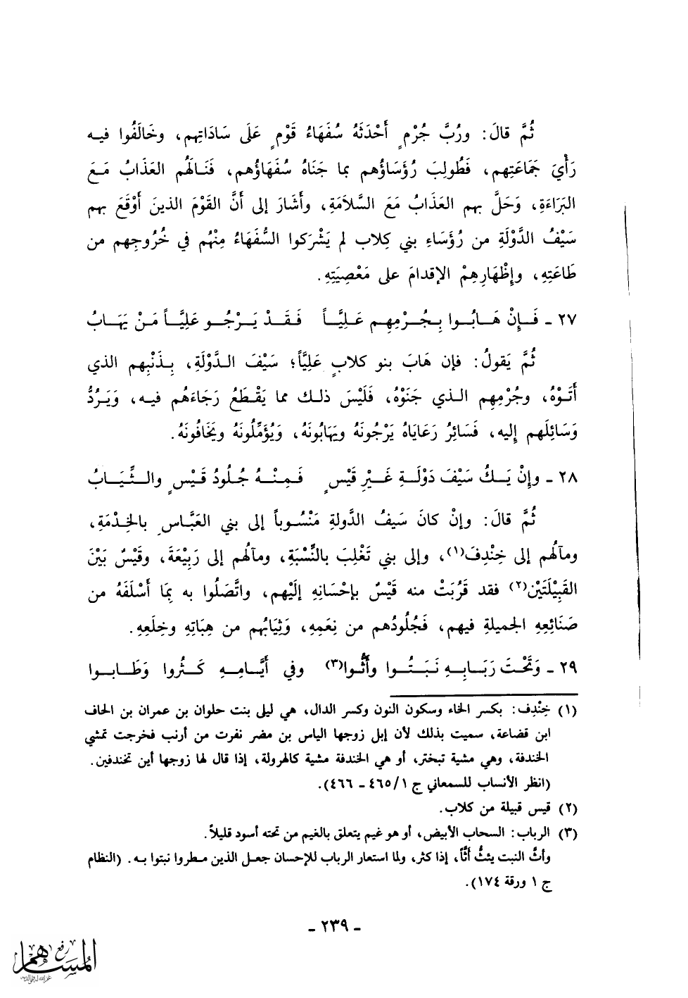 ثم قال: ورب جرم أحدثه سفهاء قوم على ساداتهم، وخالفوا فيه رأي جماعتهم، فطولب رؤساؤهم بما جناه سفهاؤهم، فنالهم العذاب مع البراءة، وحل بهم العذاب مع السلامة، وأشار إلى أن القوم الذين أوقع بهم سيف الدولة من رؤساء بني كلاب لم يشركوا السفهاء منهم في خروجهم من طاعته، وإظهارهم الإقدام على معصيته.