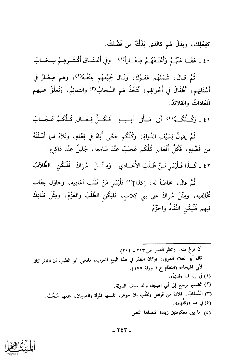 ثم يقول لسيف الدولة: وكلكم حكى أباه في فعله، وتلاه فيما أسلفه من فضله، فكل أفعال كلكم عجيب عند سامعه، جليل عند ذاكره.