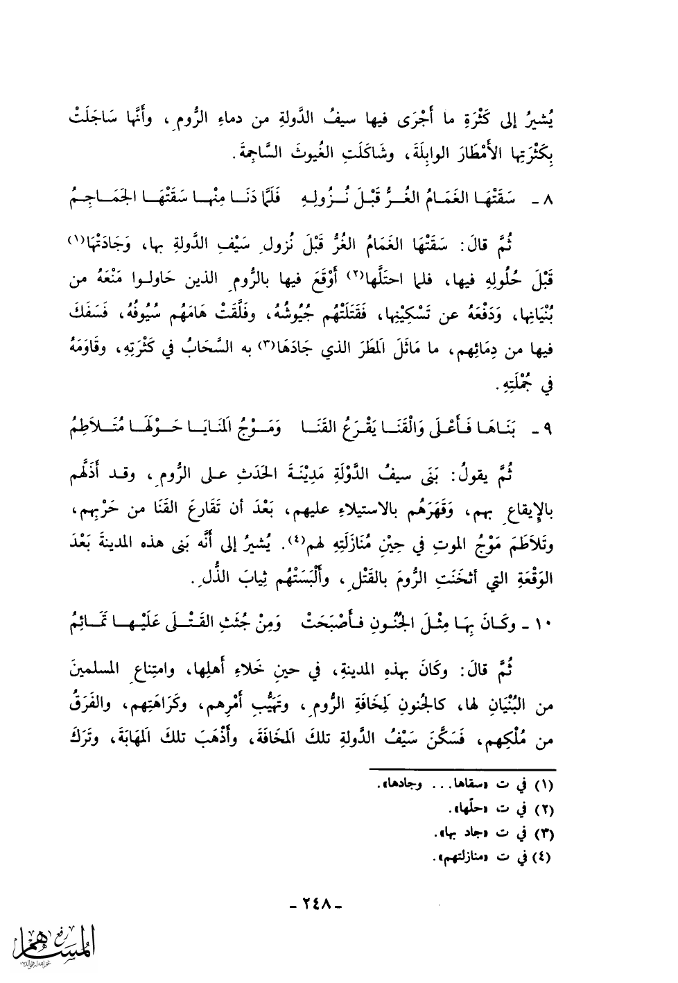 ثم قال: سقتها الغمام الغر قبل نزول سيف الدولة بها، وجادتها قبل حلوله فيها، فلما احتلها أوقع فيها بالروم الذين حاولوا منعه من بنيانها، ودفعه عن تسكينها،