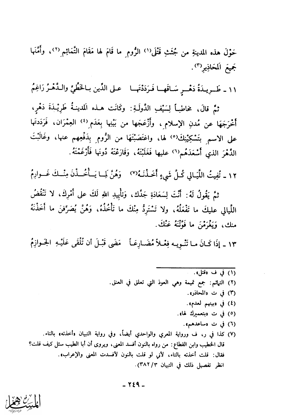 ثم قال، مخاطباً لسيف الدولة: وكانت هذه المدينة طريدة دهر، أخرجها عن مدن الإسلام، وأزعجها من بينها بعدم العمران، فرددتها على الاسم بتسكينكَ لها، واغتصبتها من الروم بدفعهم عنها، وغالبت الدهر الذي أسعدهم عليها فغلبته، وقارعته دونها فأرغمته.