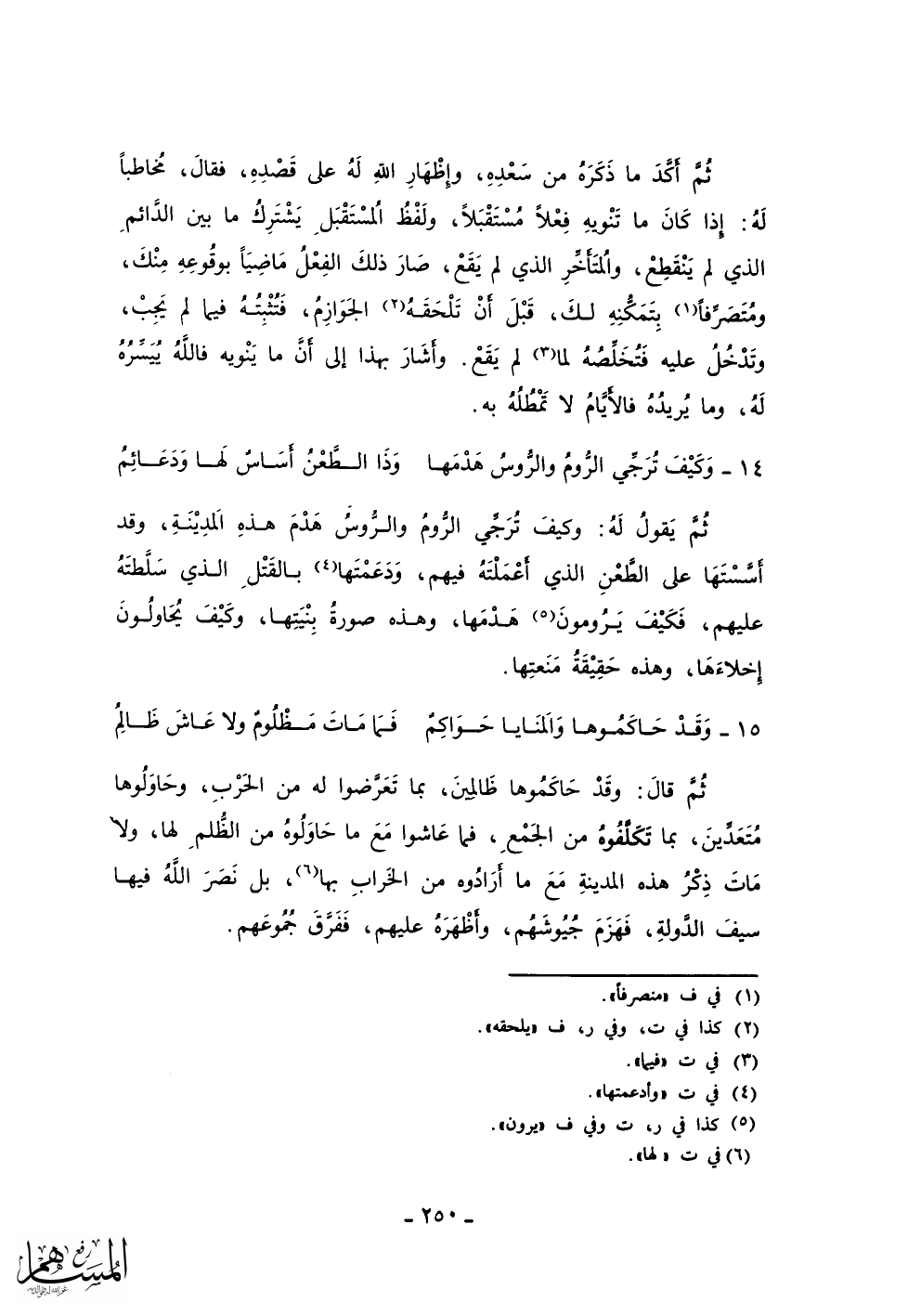 ثم قال: وقد حاكموها ظالمين، بما تعرضوا له من الحرب، وحاولوها متعدين، بما تكلفوه من الجمع، فما عاشوا مع ما حاولوه من الظلم لها، ولا مات ذكر هذه المدينة مع ما أرادوه من الخراب بها، بل نصر الله فيها سيف الدولة، فهزم جيوشهم، وأظهره عليهم، ففرق جموعهم.