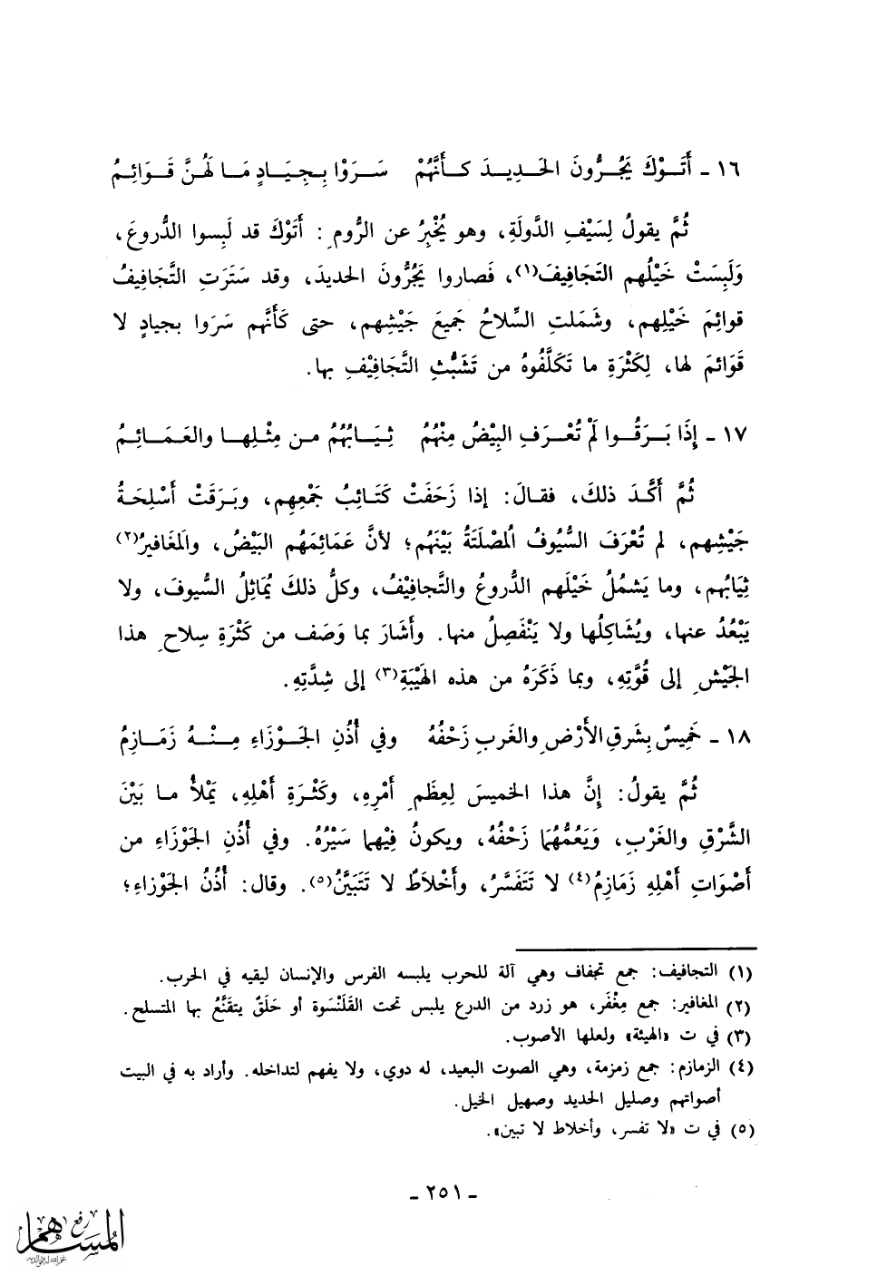 ثم يقول لسيف الدولة، وهو يخبر عن الروم: أتوك قد لبسوا الدروع، ولبست خيلهم التجافيف، فصاروا يجرون الحديد، وقد سترت التجافيف قوائم خيلهم، وشملت السلاح جميعهم جيشهم، حتى كأنهم سروا بجياد لا قوائم لها، لكثرة ما تكلفوه من تشبث التجافيف بها.