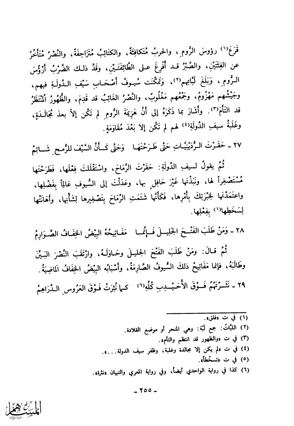 قرع رؤوس الروم، والحرب متكافئة، والكتائب متزاحفة، والنصر متأخر عن الفئتين، والصبر قد أفرغ على الطائفتين، وقد ذلك الضرب أرؤس الروم، وبلغ لباتهم، وتمكنت سيوف أصحاب سيف الدولة فيهم، وجيشهم مهزوم، وجمعهم مغلوب، والنصر الغائب قد قدم، والظهور المنتظر قد التأم. وأشار بما ذكره إلى أن هزيمة الروم لم تكن إلا بعد مجالدة، وغلبة سيف الدولة لهم لم تكن إلا بعد مقاومة.