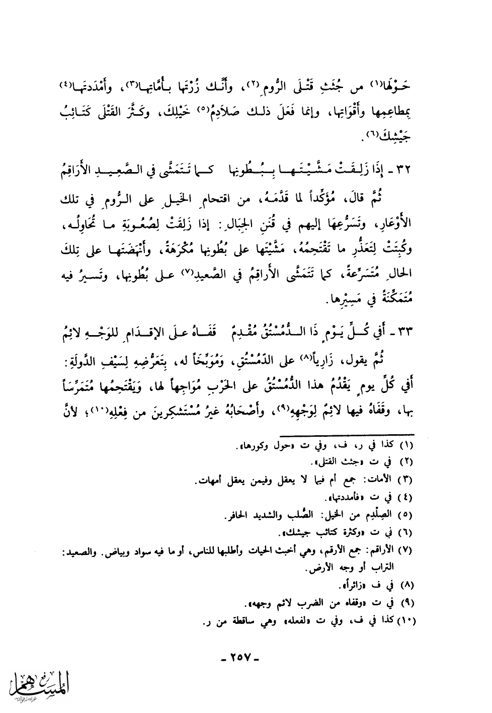ثم قال، مؤكدا لما من اقتحام الخيل على الروم في تلك الأوعار، وتسرعها إليهم في قنن الجبال: إذا زلقت لصعوبة ما تحاوله، وكبتت لتعذر ما تقتحمه، مشيتها على بطونها مكرهة، وأنهضتها على تلك الحال متسرعة، كما تتمشى الأراقم في الصعيد على بطونها، وتسير في متمكنة في مسيرها.