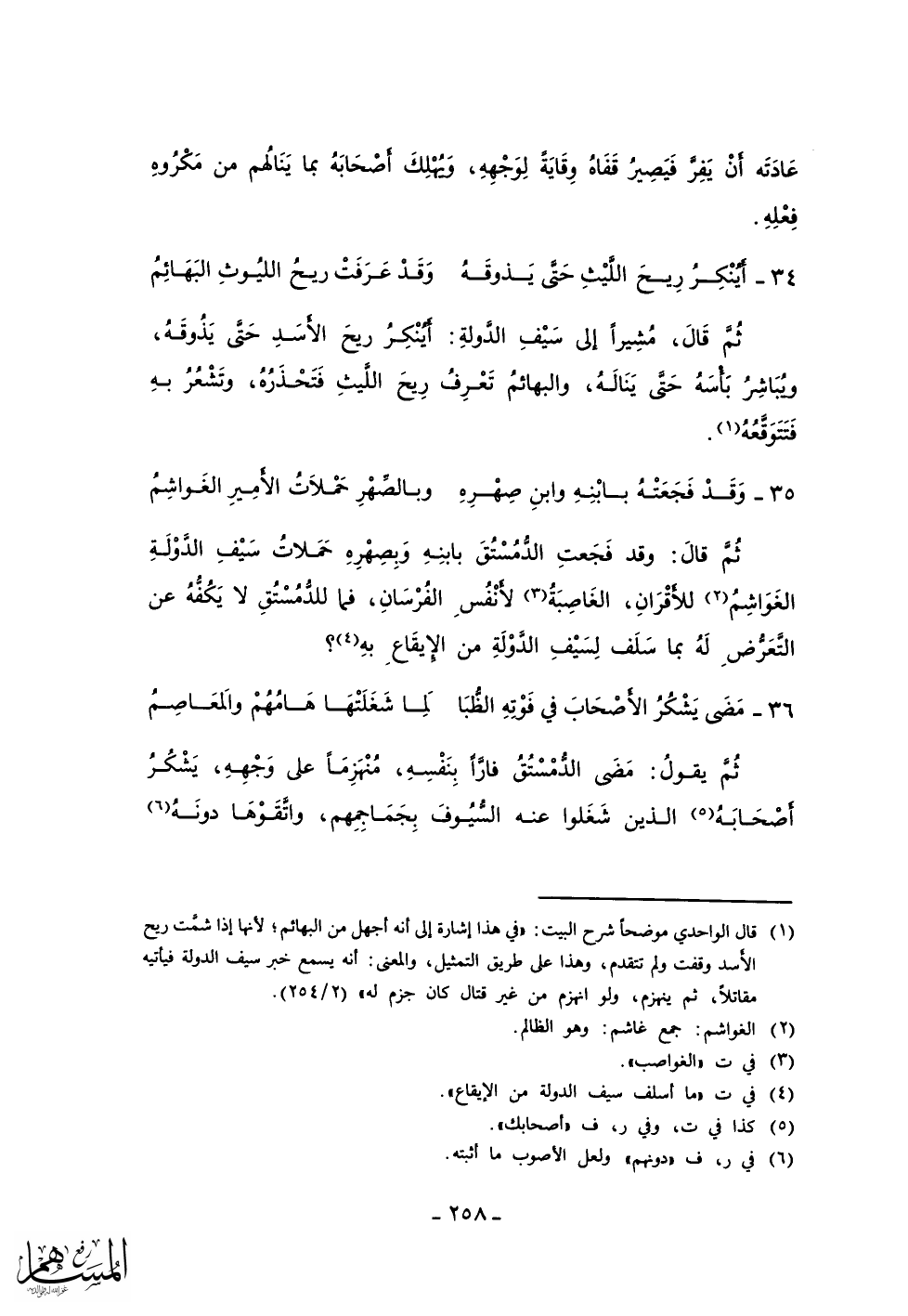 ثم قال، مشيراً إلى سيف الدولة: أينكر ويح الأسد حتى يذوقه، ويباشر بأسه حتى يناله، والباهم تعرف ريح الليث فتحذره، وتشعر به فتتوقعه.