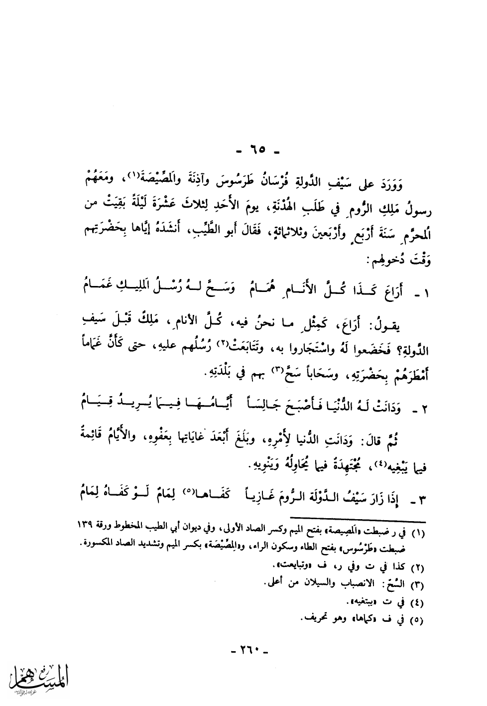 يقول: أراع، كمثل ما نحن فيه، كل الأنام، ملك قبل سيف الدولة؟ فخضعوا له واستجاروا به، وتتابعت رسلهم عليه، حتى كان غماماً أمطرهم بحضرته، وسحابا سح بهم في بلدته.