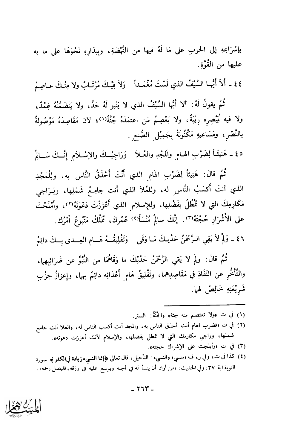 ثم يقول له: ألا أيها السيف الذي لا ينبو له حد، ولا يتضمنه غمد، ولا فيه لمبصره ريبة، ولا يعصم من اعتمده جنة؛ لأن مقاصده موصولة بالنصر، ومساعيه مكنونة بجميل الصنع.