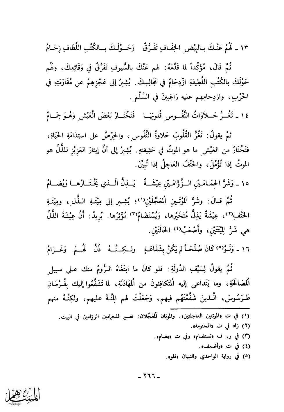 ثم قال، مؤكداً لما قدمه: لهم عنك بالسيوف تفرق في وقائعك، ولهم حولك بالكتب اللطيفة ازدحام في مجالسك. يشير إلى عجزهم عن مقاومته في الحرب، وازدحامهم عليه راغبين في السلم.