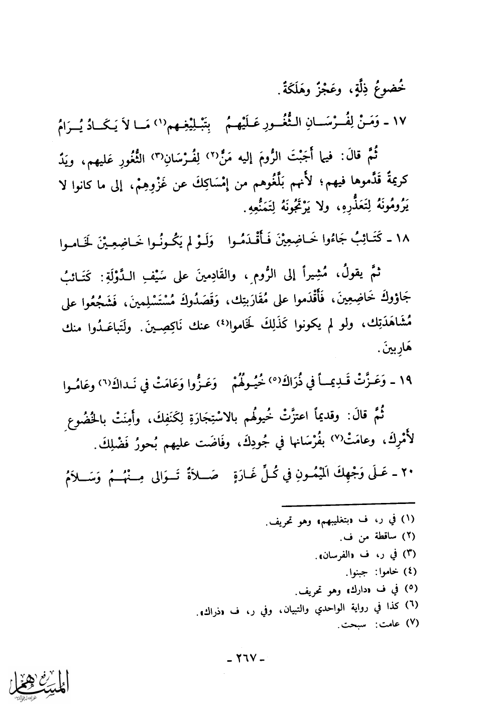 ثم يقول، مشيراً إلى الروم، والقادمين على سيف الدولة: كتائب جاءوك خاضعين، فأقدموا على مقاربتك، وقصدوك مستسلمين، فشجعوا على مشاهدتك، ولو لم يكونوا كذلك لخاموا عنك ناكصين. ولتباعدوا منك هاربين.
