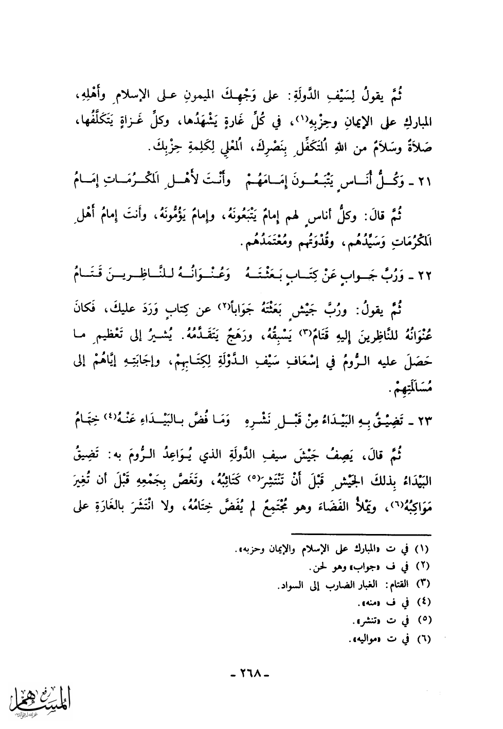 ثم يقول لسيف الدولة: على وجهك الميمون على الإسلام وأهله، المبارك على الإيمان وحزبه، في كل غارة يشهدها، وكل غزاة يتكلفها، صلاة وسلام من الله المتكفل بنصرك، المعلي لكلمة حزبك.