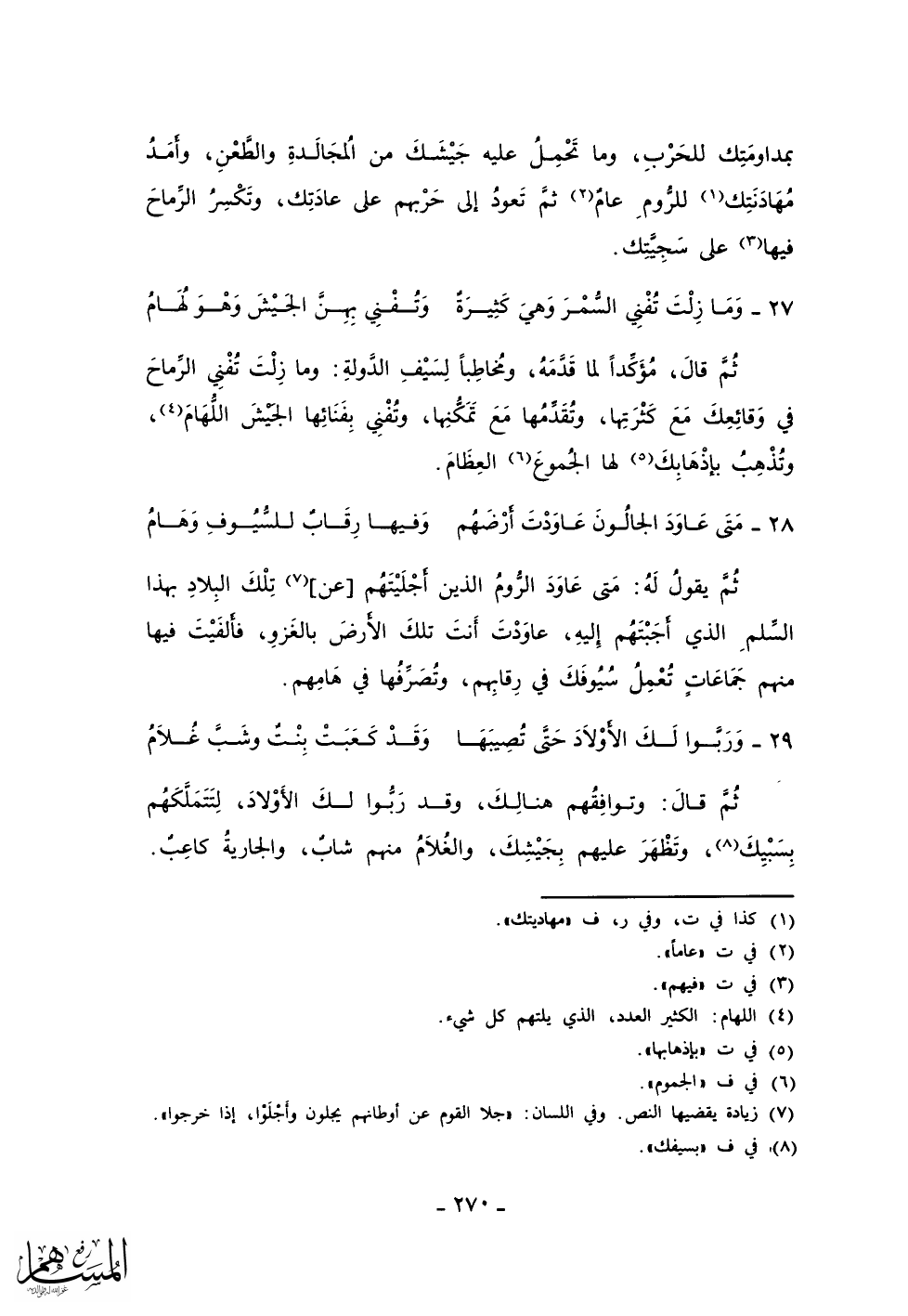 ثم يقول له: متى عاود الروم الذين أجليتهم (عن) تلك البلاد بهذا السلم الذي أجبتهم إليه، عاودت أنت تلك الأرض بالغزو، فألفيت فيها منهم جماعات تعمل سيوفك في رقابهم، وتصرفها في هامهم.