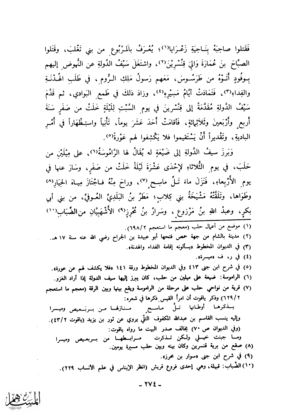فقتلوا صاحبه بناحية زعرايا؛ يعرف بالمربوع من بني تغلب، وقتلوا الصباح بن عمارة والي قنسرين، واشتغل سيف الدولة عن النهوض إليهم، بوفود أتوه من طرسوس، معهم رسول ملك الروم، في طلب الهدنة والفداء، فتمادت أيام مسيرة، وزاد ذلك في طمع البوادي، ثم قدم سيف الدولة مقدمة إلى قنسرين في يوم السبت لليلة خلت من صفر سنة أربع وأربعين وثلاثمائة، فأقامت أحد عشر يوماً، تأنياً واستظهاراً في أمر البادية، وتقديراً أن يستقيموا فلا يكشفوا لهم عورة.