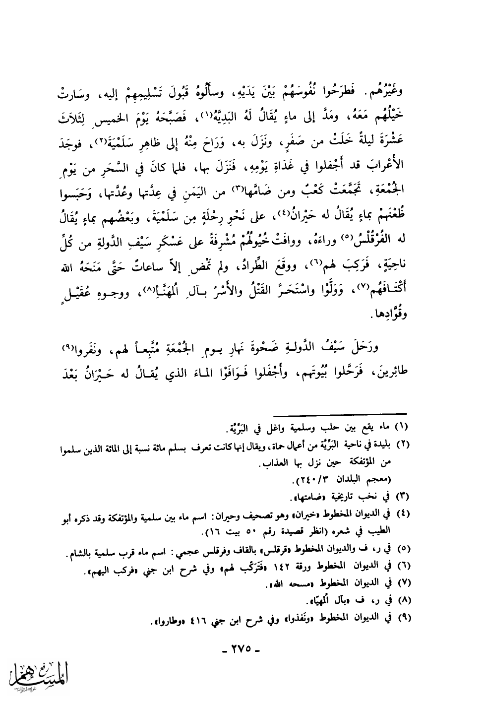 ورحل سيف الدولة ضحوة نهار يوم الجمعة متبعاً لهم، ونفروا طائرين، فرحلوا بيوتهم، وأجفلوا فوافوا الماء الذي يقال له حيران بعد