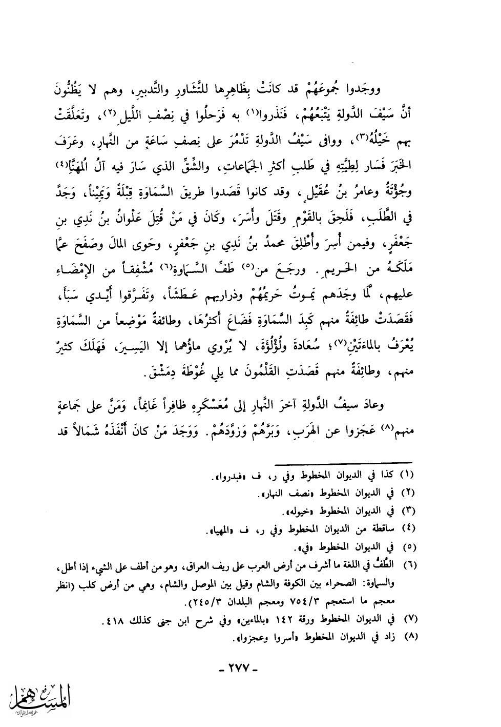 ووجدوا جموعهم قد كانت بظاهرها للتشاور والتدبير، وهم لا يظنون أن سيف الدولة يتبعهم، فنذروا به فرحلوا في نصف الليل، وتعلقت بهم خيله، ووافى سيف الدولة تدمر على نصف ساعة من النهار، وعرف الخبر فسار لطيته في طلب أكثر الجماعات، والشق الذي سار فيه آل المهنأ وجؤته وعامر بن عقيل، وقد كانوا قصدوا طريق السماوة قبلة ويميناً، وجد في الطلب، فلحق بالقوم وقتل وأسر، وكان في من قتل علوان بن ندي بن جعفر، وفيمن أسر وأطلق محمد بن ندي بن جعفر، وحوى المال وصفح عما ملكه من الحريم. ورجع من طف السماوة مشفقاً من الإمضاء عليهم، لما وجدهم يموت حريمهم وذراريهم عطشاً،