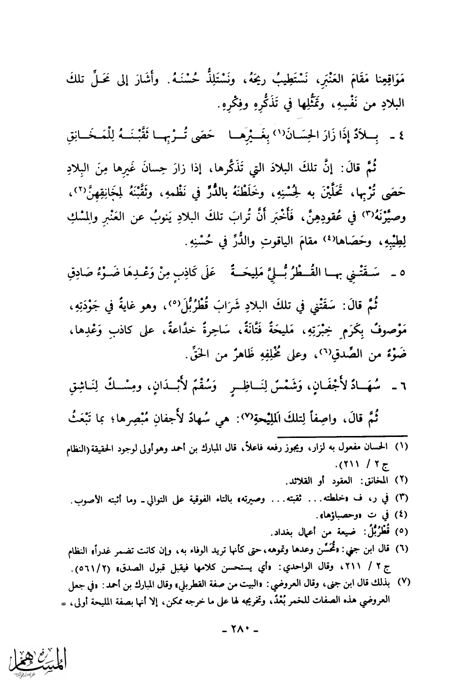 مواقعنا مقام العنبر، نستطيب ريحه، ونستلذ حسنه. وأشار إلى محل تلك البلاد من نفسه، وتمثلها في تذكره وفكره.