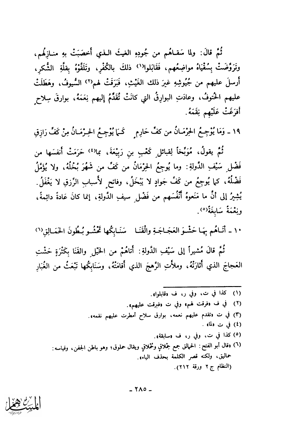ثم قال: ولما سقاهم من جوده الغيث الذي أخصبت به منازلهم، وتروضت بسقياه مواضعهم، فقابلوا ذلك بالكفر، وتلقوه بقلة الشكر، أرسل عليهم من جيوشه غير ذلك الغيث، قبرقت لهم السيوف، وهطلت عليهم الحتوف، وعادت البوارق التي كانت تقدم إليهم نعمة، بوارق سلاح أفرغت عليهم نقمة.
