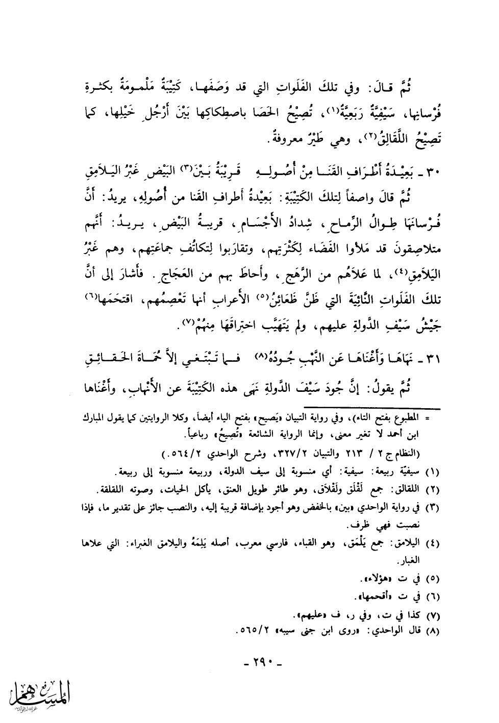 ثم قال: وفي تلك الفلوات التي قد وصفها، كتيبة ملمومة بكثرة فرسانها، سيفية ربيعة، تصيح الحصا باصطكاكها بين أرجل خيلها، كما تصيح اللقالق، وهي طير معروفة.