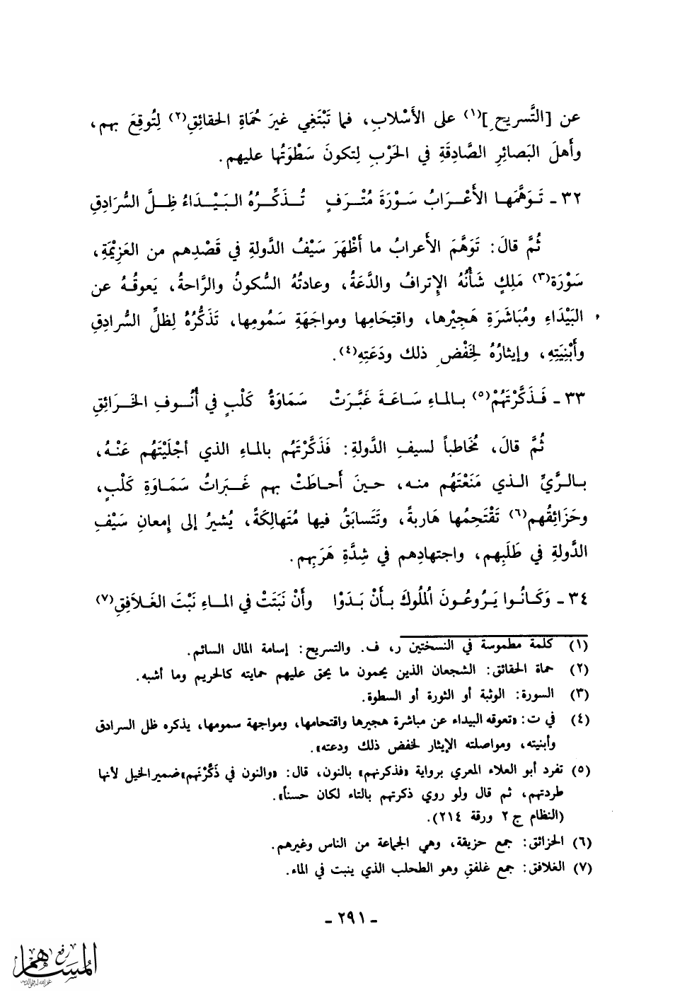 ثم قال، مخاطباً لسيف الدولة: فذكرتهم بالماء الذي أجليتهم عنه، بالري الذي منعتهم منه، حين أحاطت بعم غبرات سماوة كلب، وحزائقهم تقتحمها هاربة، وتتسابق فيها متهالكة، يشير إلى إمعان سيف الدولة في طلبهم، واجتهادهم في شدة هربهم.