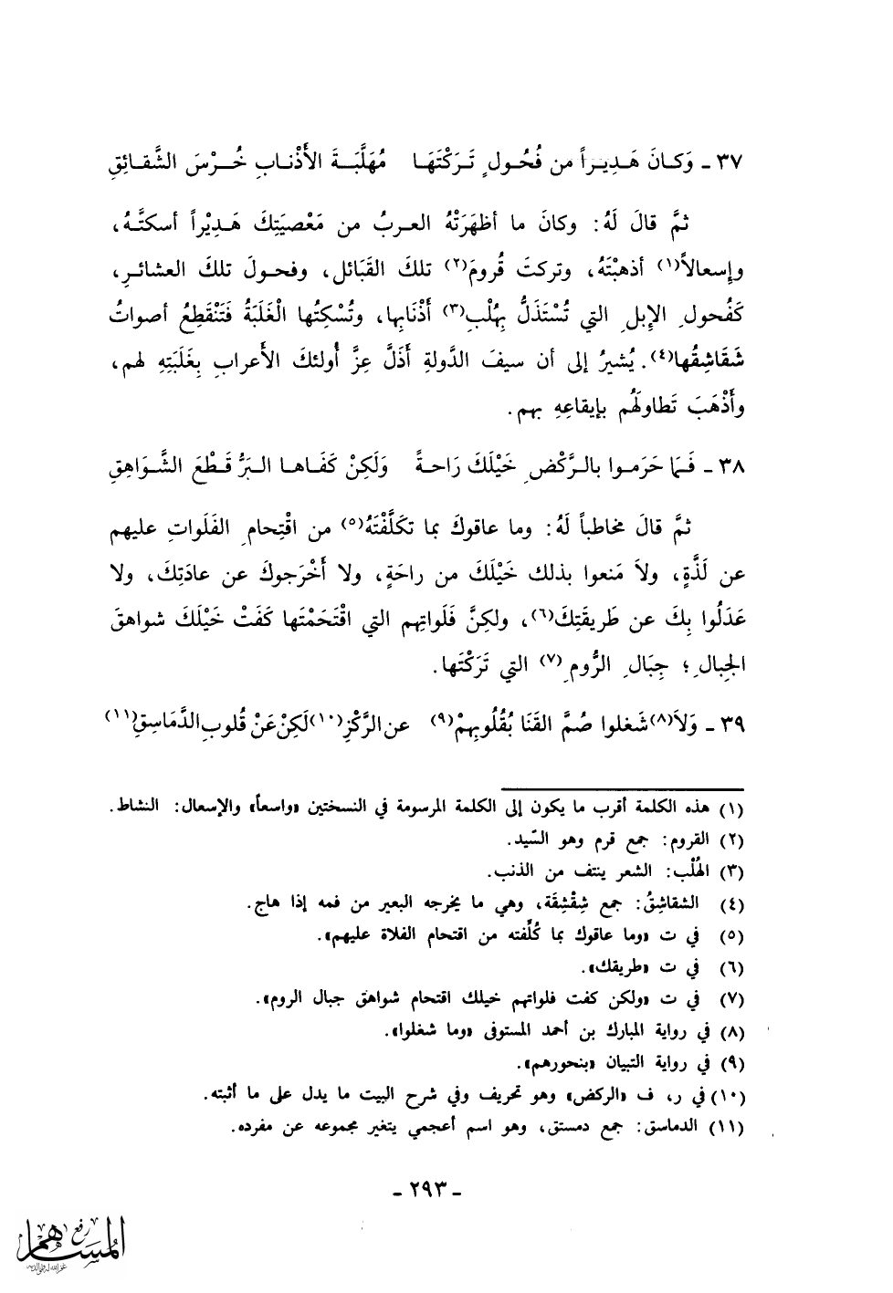 ثم قال له: وكان ما أظهرته العرب من معصيتك هديراً أسكته، وإسعالاً أذهبته، وتركت قروم تلك القبائل، وفحول تلك العشائر، كفحول الإبل التي تستذل بهلب أذنابها، وتسكتها الغلبة فتنقطع أصوات شقاشقها. يشير إلى أن سيف الدولة أذل عز أولئك الأعراب بغلبته لهم، وأذهب تطاولهم بإيقاعه بهم.