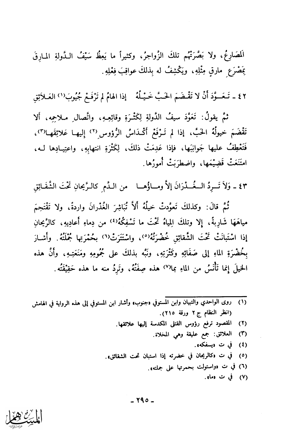 ثم قال: وكذلك تعودت خيله ألا تباشر الغدران واردة، ولا تقتحم مياهها شاربة، إلا وتلك المياه تحت ما تسفكه من دماء أعاديه، كالريحان إذا استبانت تحت الشقائق خضرته، بحمرتها جملته. وأشار بخضرة الماء إلى صفائه وكثرته، ونبه بذلك على جمومه ومنعته، وأن هذه الخيل إنما تأنس من الماء بما هذه صفته، وترد منه ما هذه حقيقته.