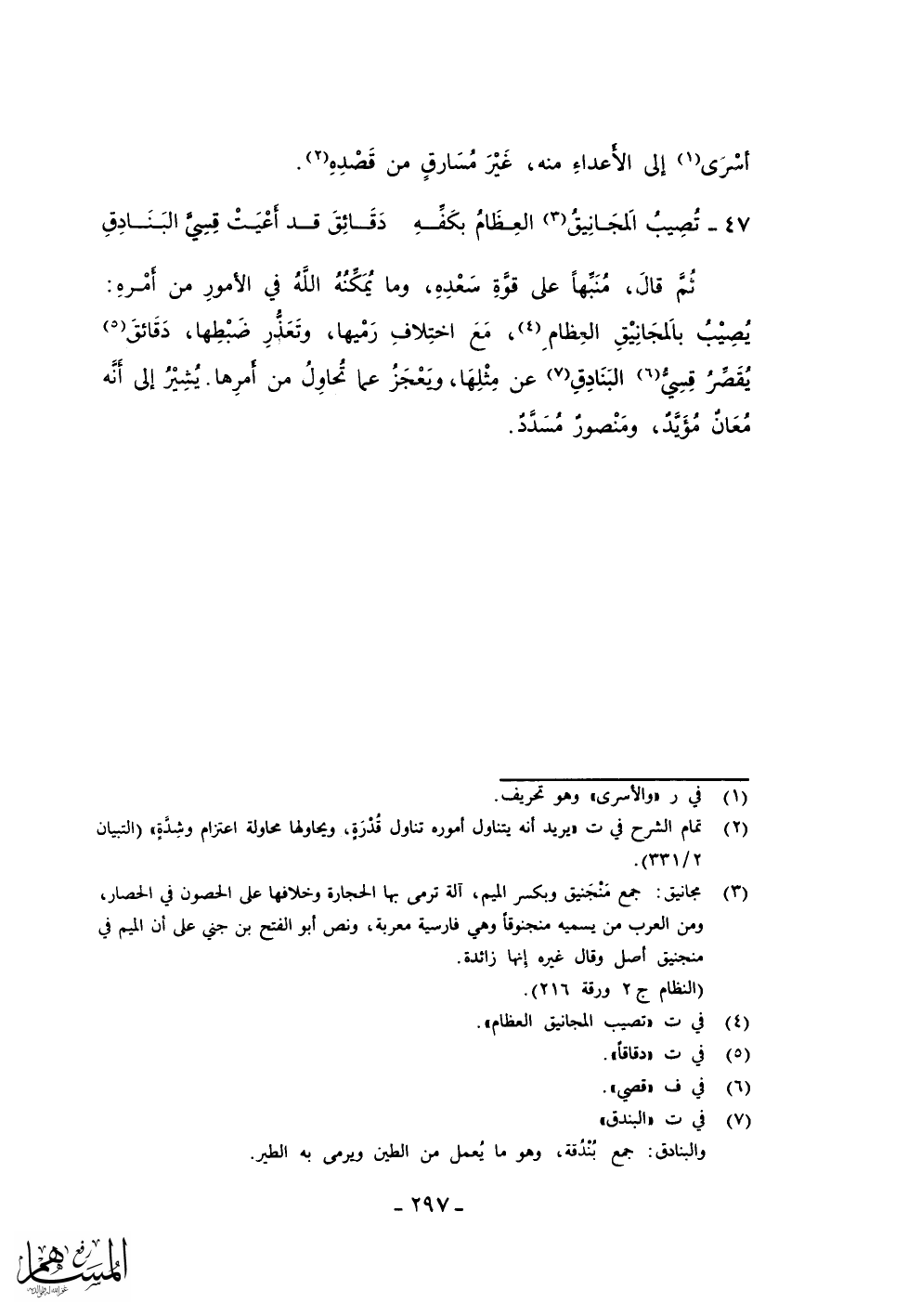 تُصِيبُ المَجَانِيقُ العِظَامُ بكَفَّهِ ... دَقَائقَ قد أَعْيَتْ قِسيَّ البَنَادِقِ