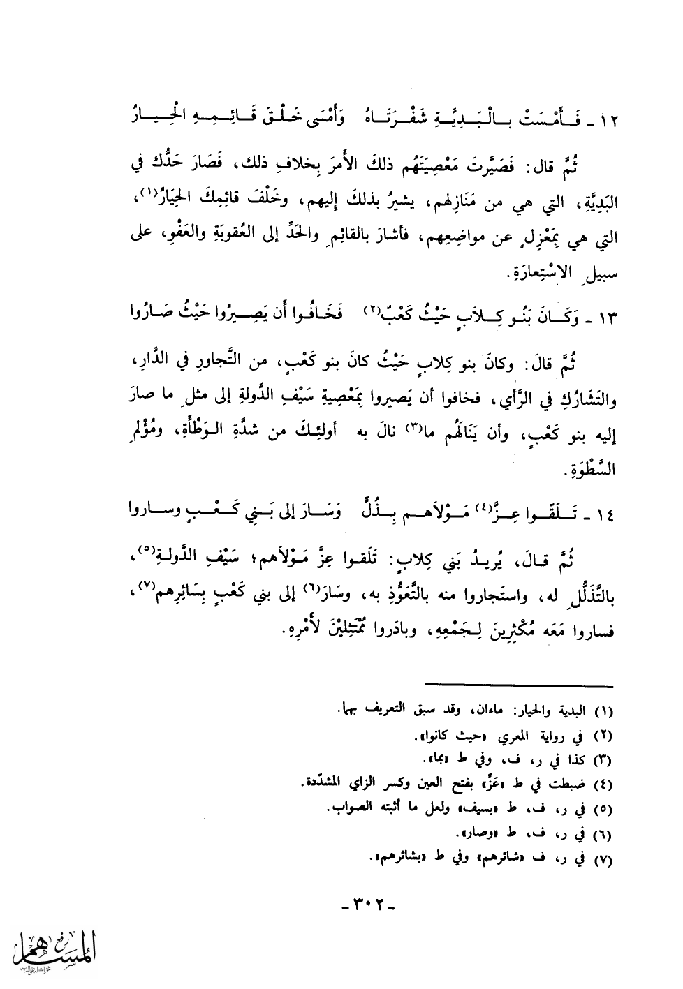 ثم قال، يريد بني كلاب: تلقوا عز مولاهم؛ سيف الدولة، بالتذلل له، واستجاروا منه بالتعوذ به، وسار إلى بني كعب بسائرهم، فساروا معه مكثرين لجمعه، وبادروا ممتثلين لأمره.
