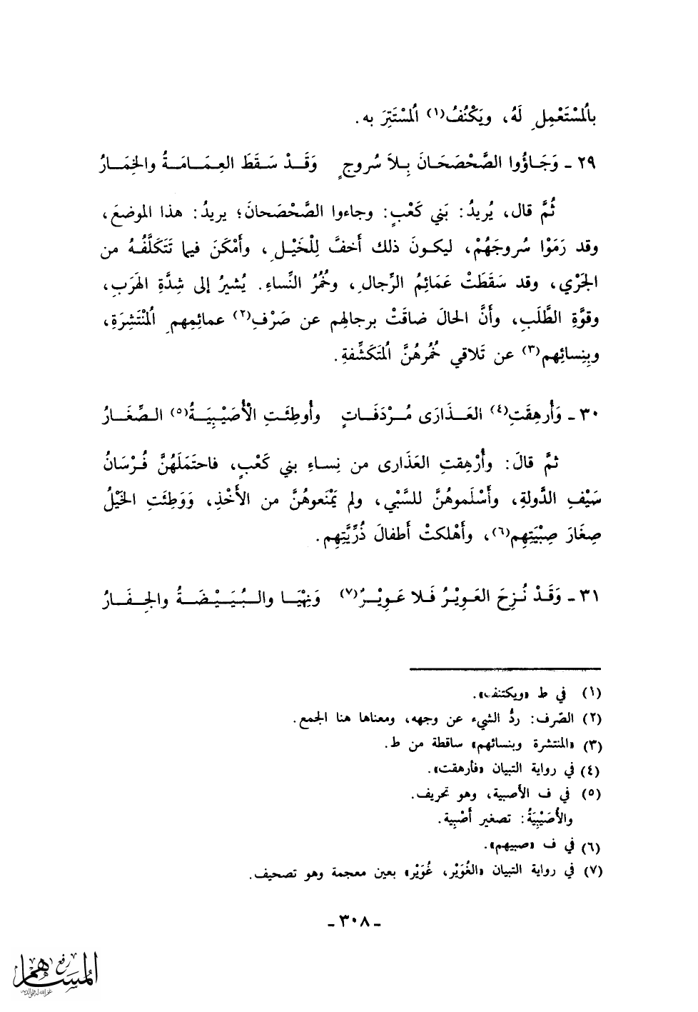 ثم قال، يريد: بني كعب: وجاءوا الصحصحان؛ يريد: هذا الموضع، وقد رموا سروجهم، ليكون ذلك أخف للخيل، وأمكن فيما تتكلفه من الجري، وقد سقطت عمائم الرجال، وخمر النساء. يشير إلى شدة الهرب، وقوة الطلب، وأن الحال ضاقت برجالهم عن صرف عمائمهم المنتشرة، وبنسائهم عن تلاقي خمرهن المتكشفة.