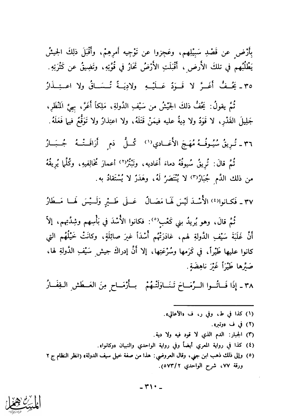 ثم قال، وهو يريد بني كعب: فكانوا الأسد في بأسهم وشدتهم، إلا أن غلبة سيف الدولة لهم، غادرتهم أسداً غير صائلة، وكانت خيلهم التي كانوا عليها طيراً، في كرمها وسرعتها، إلا أن إدراك جيش سيف الدولة لها، صيرها طيراً غير ناهضة.