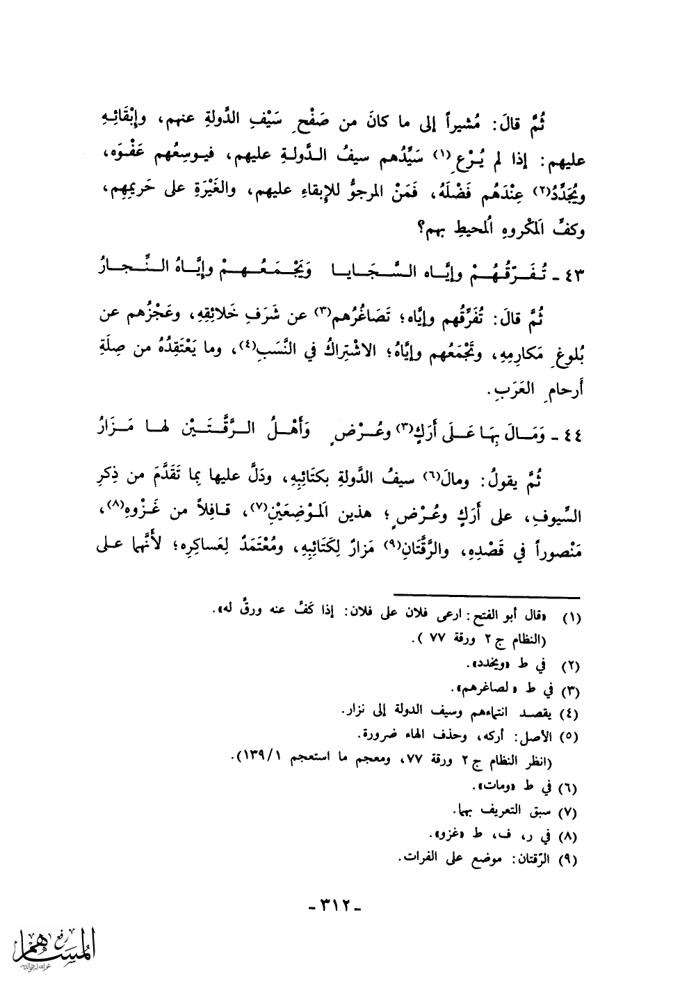 ثم يقول: ومال سيف الدولة بكتائبه، ودل عليها بما تقدم من ذكر السيوف، على أرك وعرض؛ هذين الموضعين، قافلاً من غزوه، منصوراً في قصده، والرقتان مزار لكتائبه، ومعتمد لعساكره؛ لأنهما على