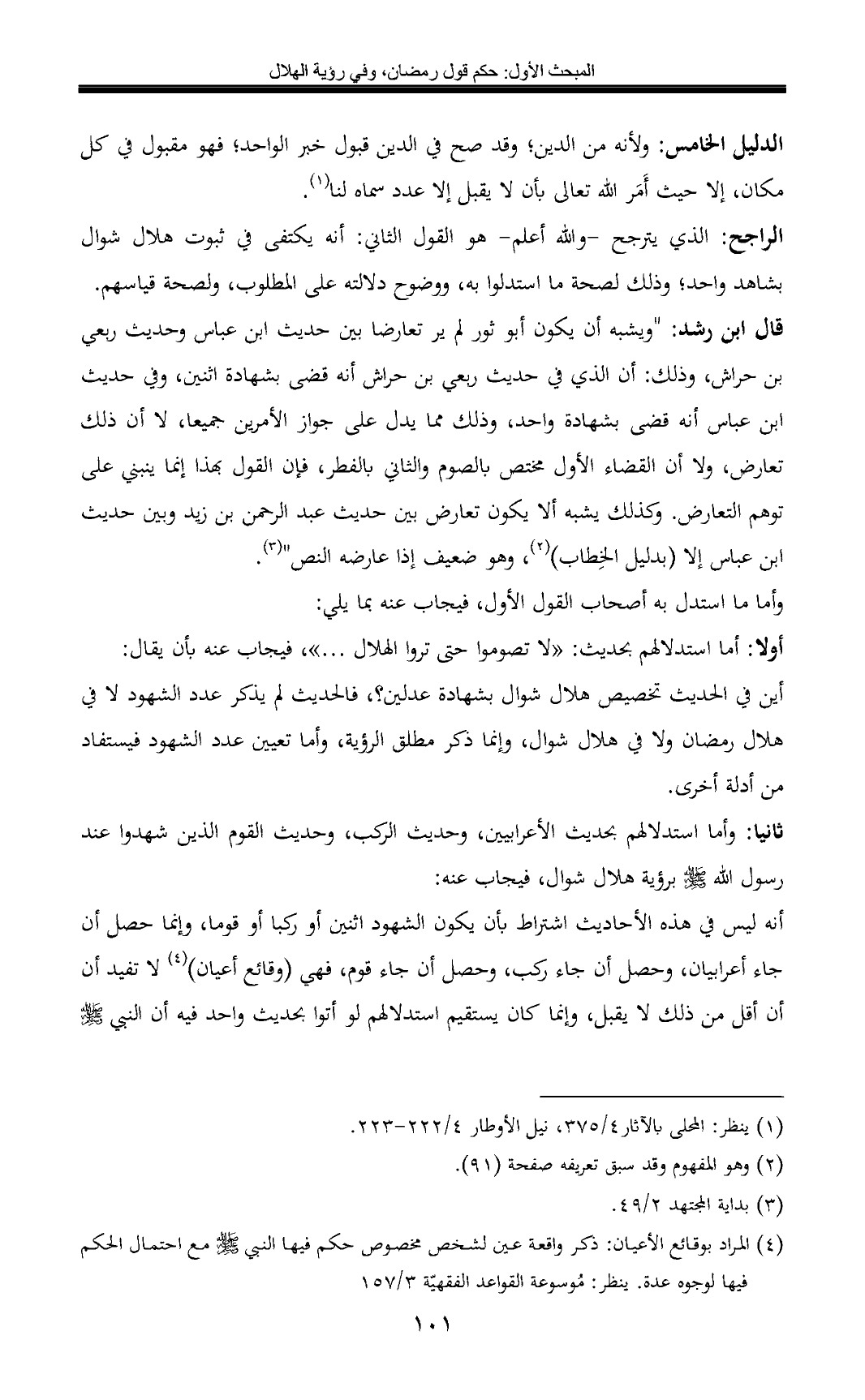 ثانيا: وأما استدلالهم بحديث الأعرابيين, وحديث الركب, وحديث القوم الذين شهدوا عند رسول الله - صلى الله عليه وسلم - برؤية هلال شوال, فيجاب عنه: