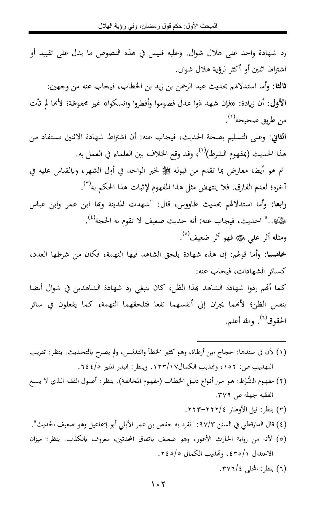 رد شهادة واحد على هلال شوال. وعليه فليس في هذه النصوص ما يدل على تقييد أو اشتراط اثنين أو أكثر لرؤية هلال شوال.